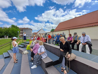 Po pietų apžiūrėjome Seminarijos Švč. Trejybės bažnyčią, kur, kaip pasakojo kun. Gintas, kažkada visi seminaristai netilpdavo... Suklaupėme adoracijai – garbė Dievui už visa, ką yra mums padaręs! Prie mūsų prisijungė mūsų ilgametė gidė p. Eglė, kuri nusivedė ir susisodino visus amfiteatre prie Kauno pilies ir apie ją papasakojo. Užėjom į šv. Jurgio kankinio bažnyčią, ir tada turintys jėgų dar pasidairė po Santaką ir apėjo Kauno pilį. Atsisveikinę su gide, patraukėme Rotušės aikštės pakraščiu iki Kauno arkikatedros, pailsėjome ant suoliukų medžių pavėsyje ir Maironio draugijoje. Prie Vytauto bažnytėlės mūsų jau laukė autobusas. Pavargę, bet pilni įspūdžių, grįžome namo.
